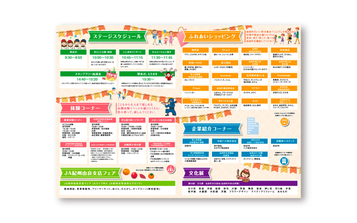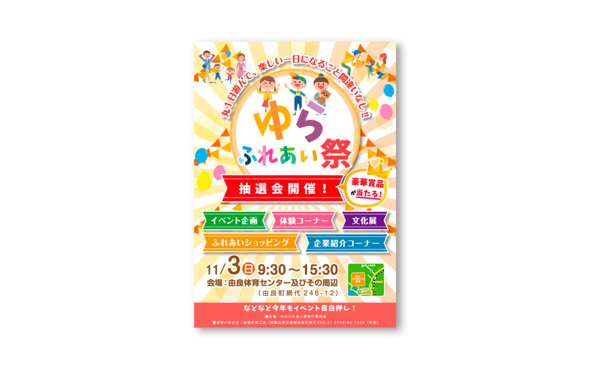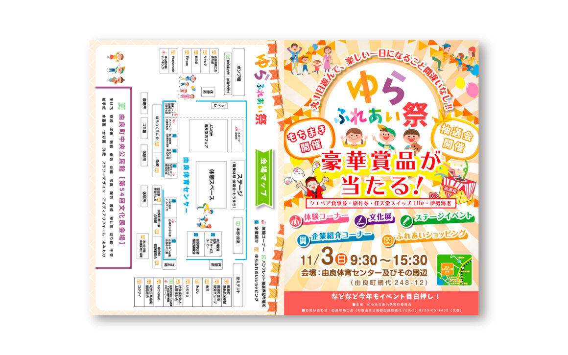 由良町で開催されているゆらふれあい祭のチラシとパンフレットを作成させていただきました。 オレンジ色をベースに、規模と楽しさとが伝わるよう派手な色と大きめのフォントでデザインいたしました。