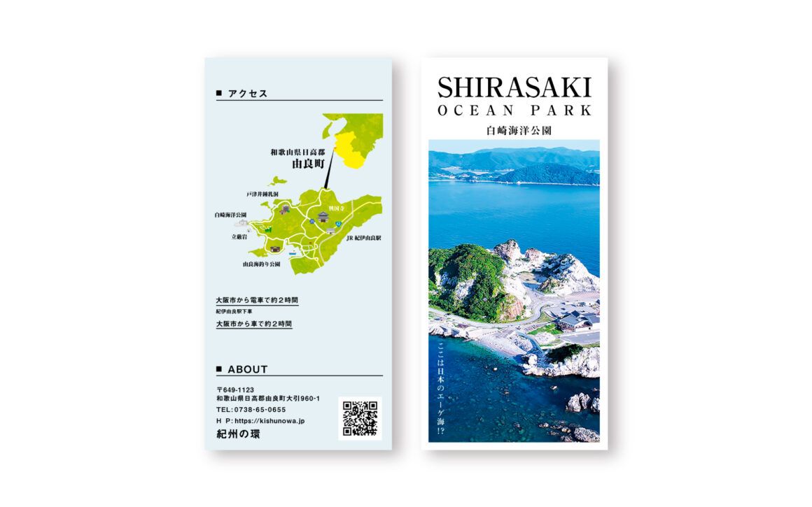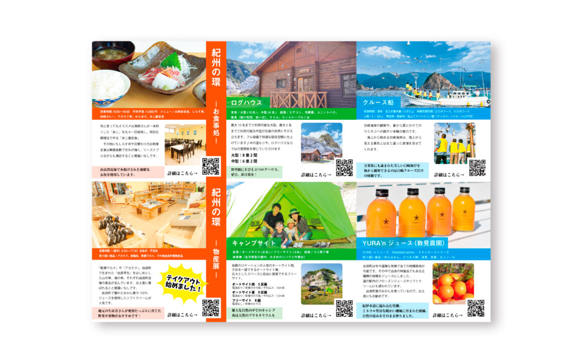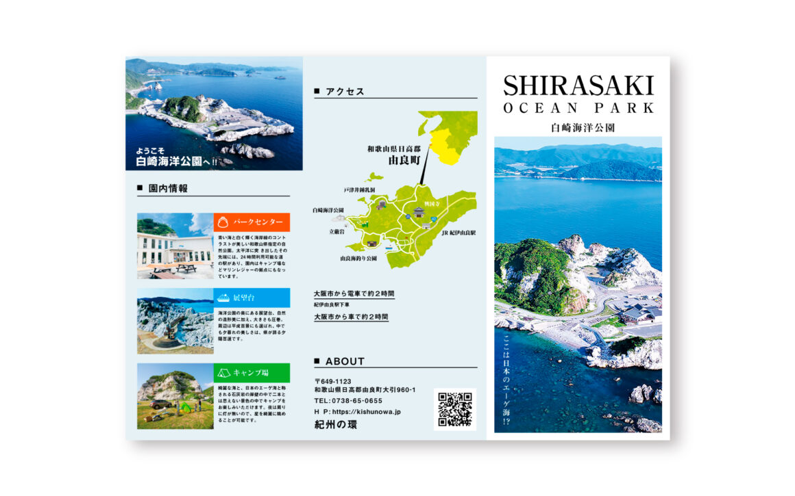 由良町海洋公園の三つ折りパンプレットを作成させていただきました。色でジャンルを区切り、写真を使ったシンプルでわかりやすいデザインを意識して作成いたしました。
