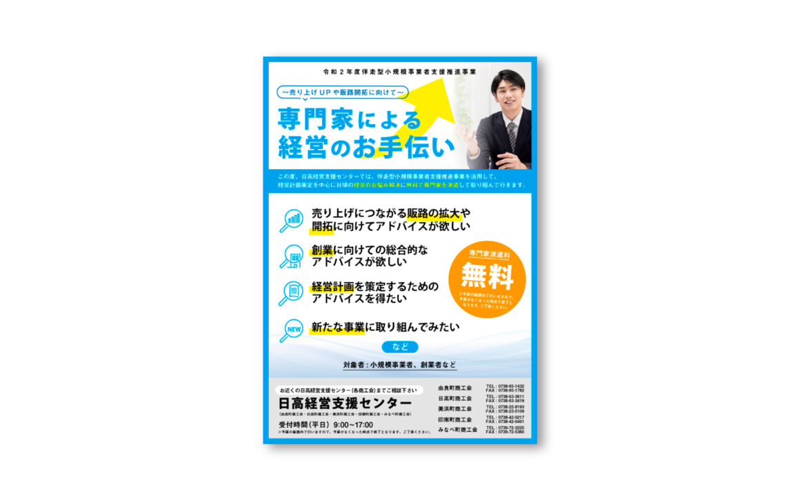 新たな事業や、未来について考えている人に、新しさとポジティブなイメージをもって相談してもらえるよう、青をベースにコントラストをハッキリさせたデザインにしております。